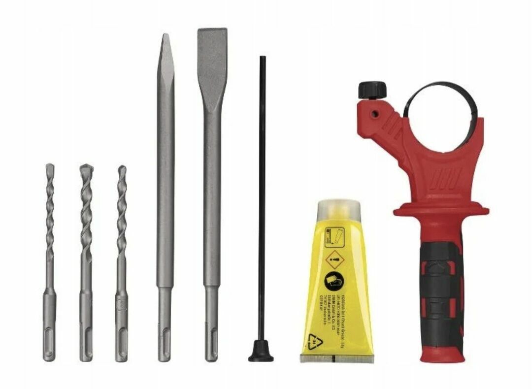 Akcesoria: 1 dłuto ostre (250 mm), 1 dłuto płaskie (250 mm), 3 wiertła SDS (Ø 6/8/10 x 150 mm), 1 ogranicznik głębokości, smar specjalny 50 g, 1 dodatkowy uchwyt ręczny